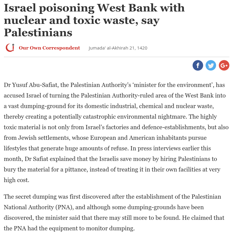 This article is from Oct 1, 1999. Israel has been dumping toxic radioactive waste in the West Bank for decades. This has been confirmed by scientific findings of not naturally occurring radionuclides near Hebron. Now tell me again how it all started on Oct 7, 2023.