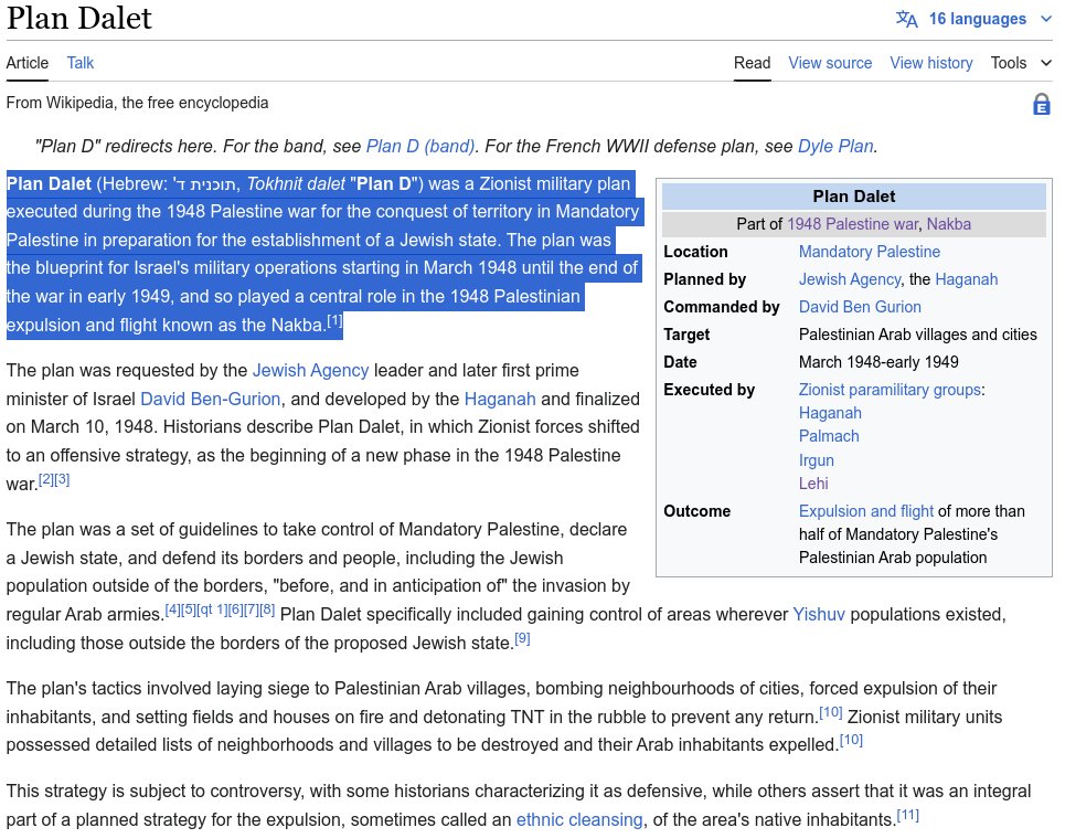 Plan Dalet (Hebrew: תוכנית ד', Tokhnit dalet "Plan D") was a Zionist military plan executed during the 1948 Palestine war for the conquest of territory in Mandatory Palestine in preparation for the establishment of a Jewish state. The plan was the blueprint for Israel's military operations starting in March 1948 until the end of the war in early 1949, and so played a central role in the 1948 Palestinian expulsion and flight known as the Nakba.